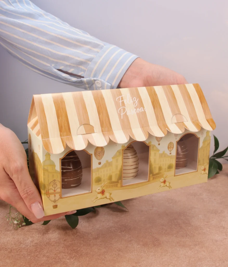 Caixa casinha para trio de mini ovo em pé, CARROSSEL DE COELHOS, pacote com 5 unidades