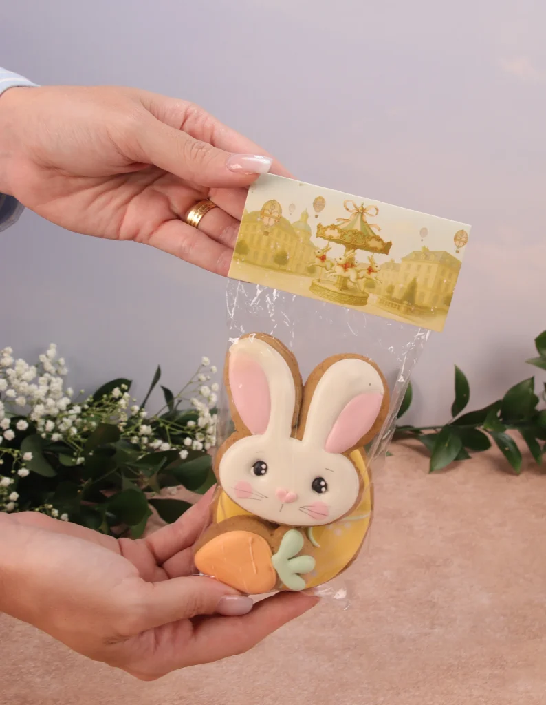 Cartão para biscoito ou barrinha, CARROSSEL DE COELHOS, pacote com 10 unidades