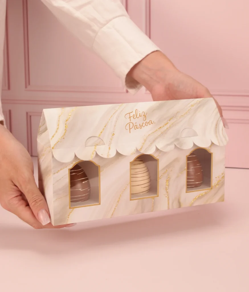 Caixa casinha para trio de mini ovo em pé, MÁRMORE, pacote com 5 unidades