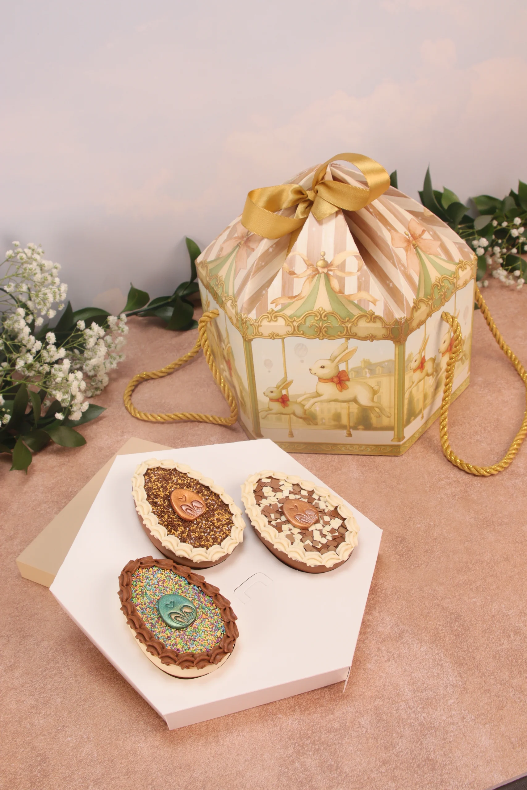 Caixa para drageados, CARROSSEL DE COELHOS, pacote com 10 unidades