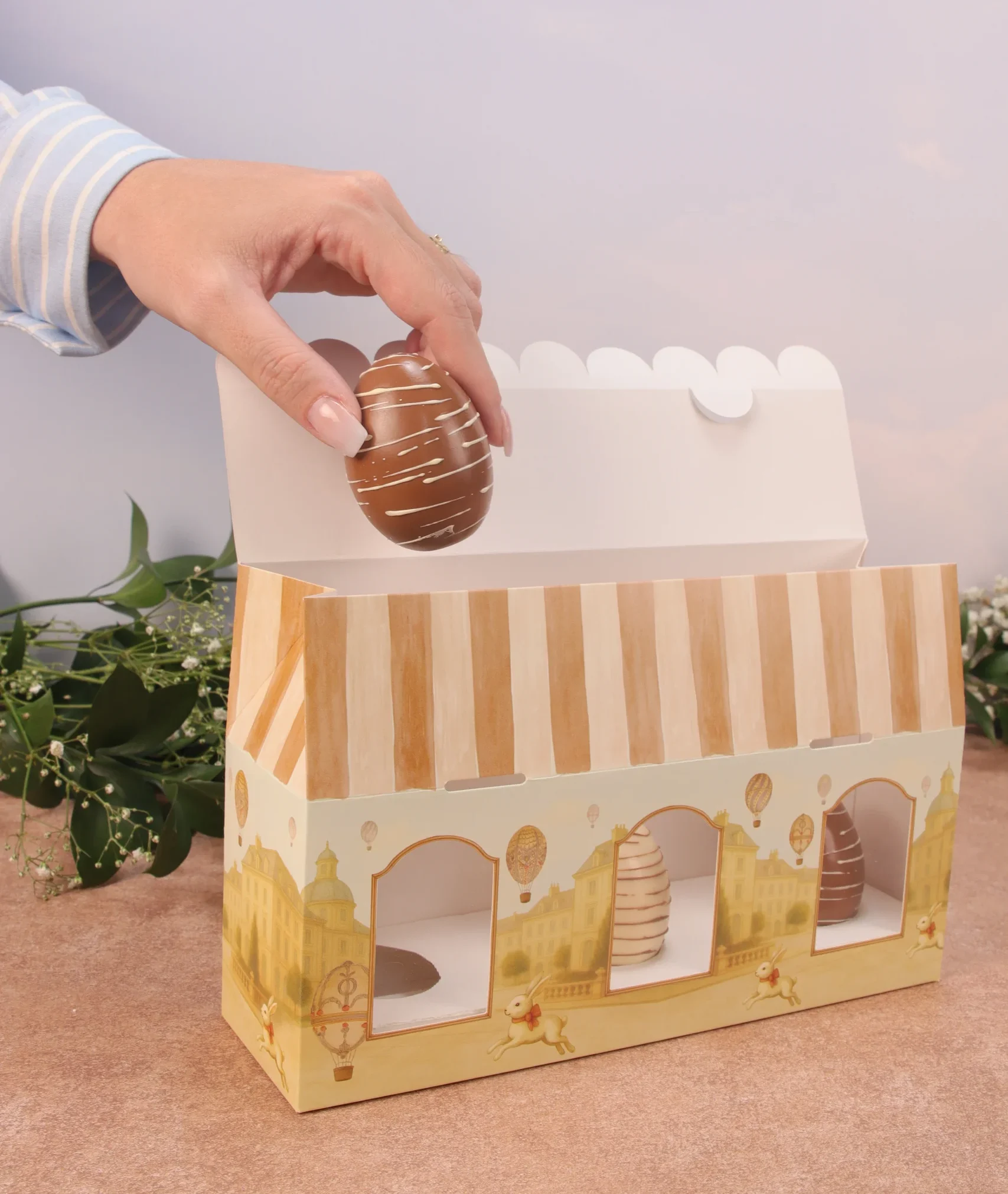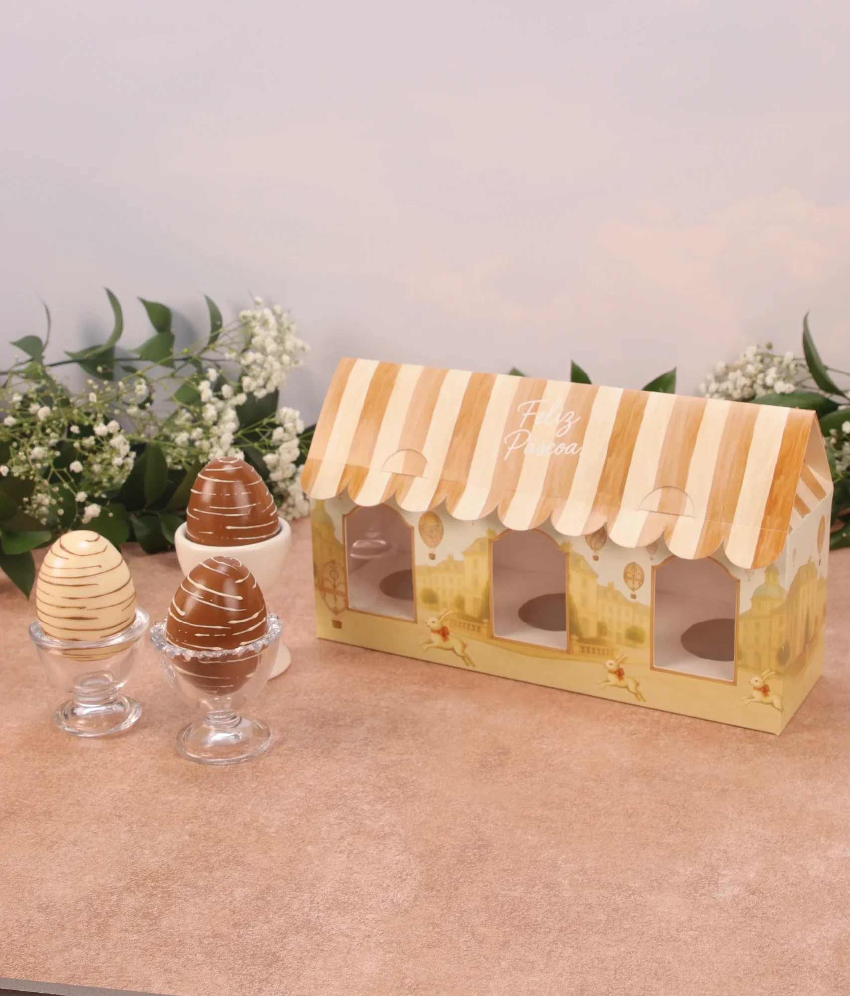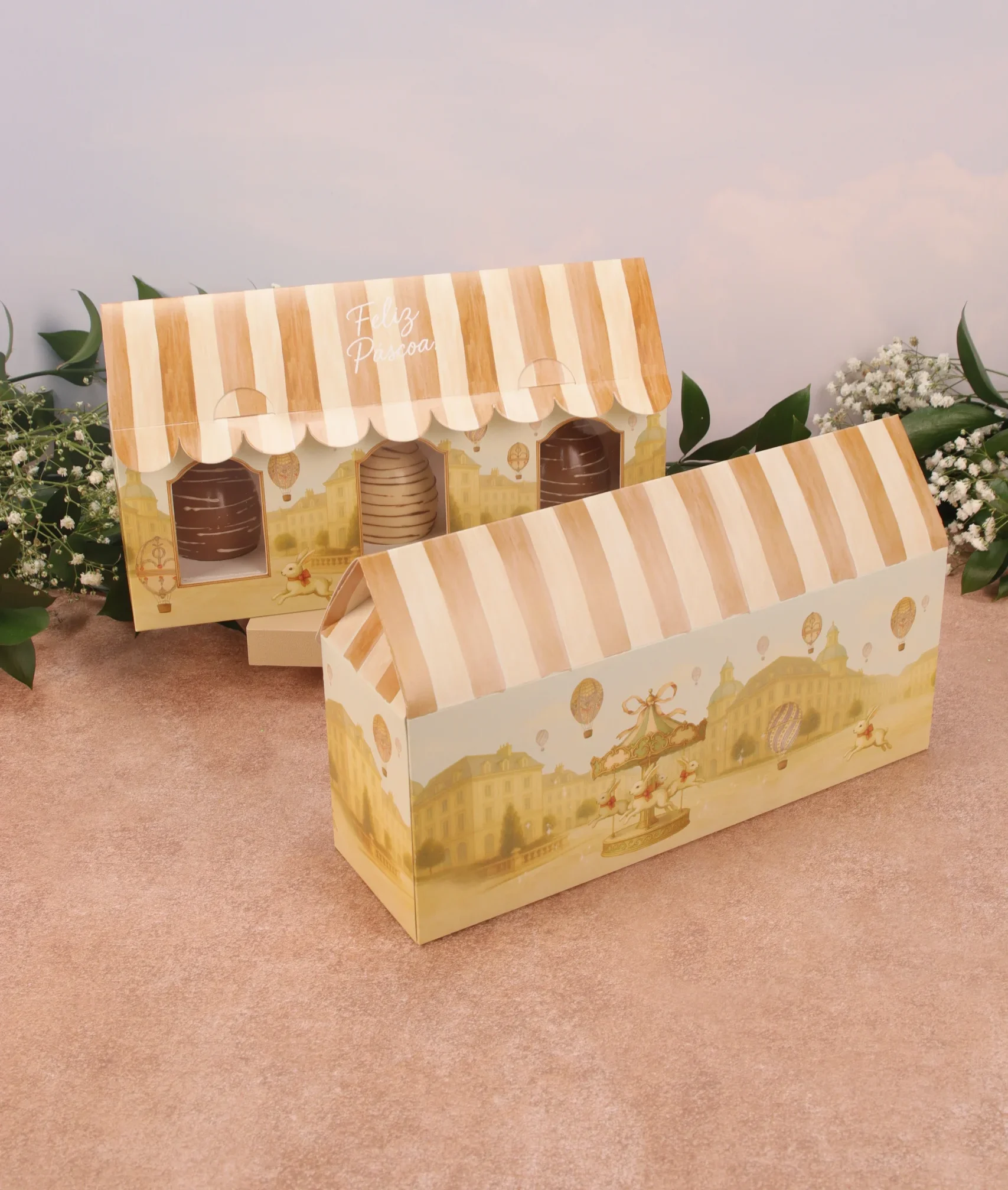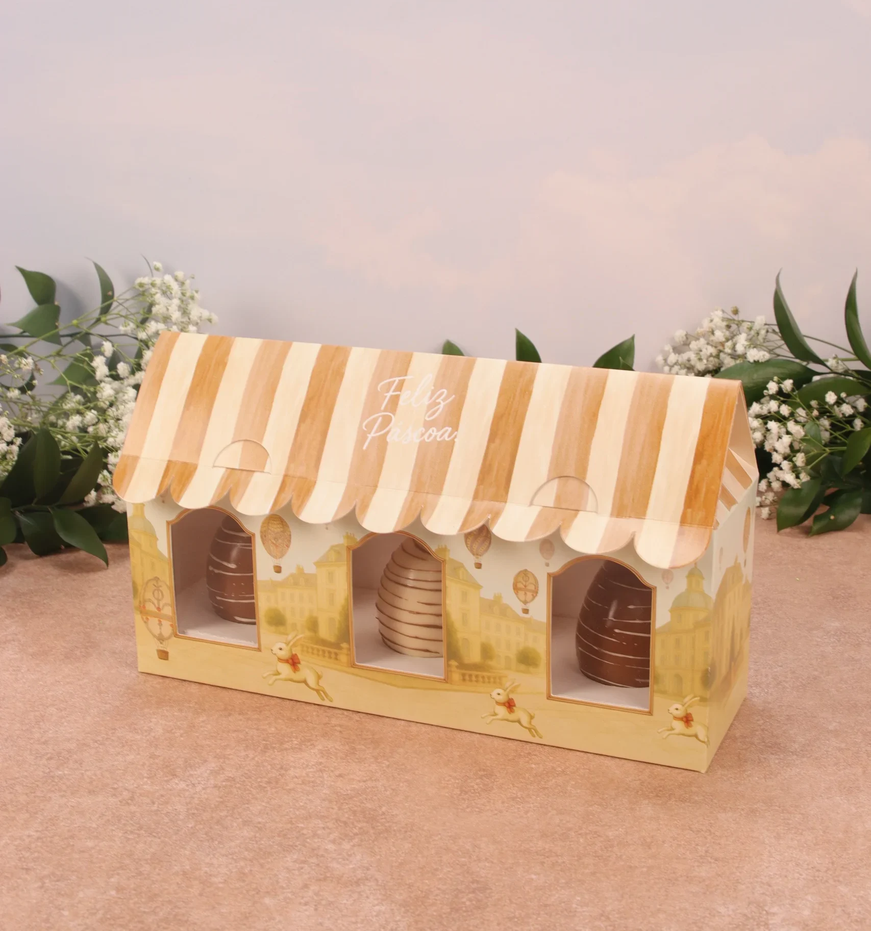 Caixa casinha para trio de mini ovo em pé, CARROSSEL DE COELHOS, pacote com 5 unidades