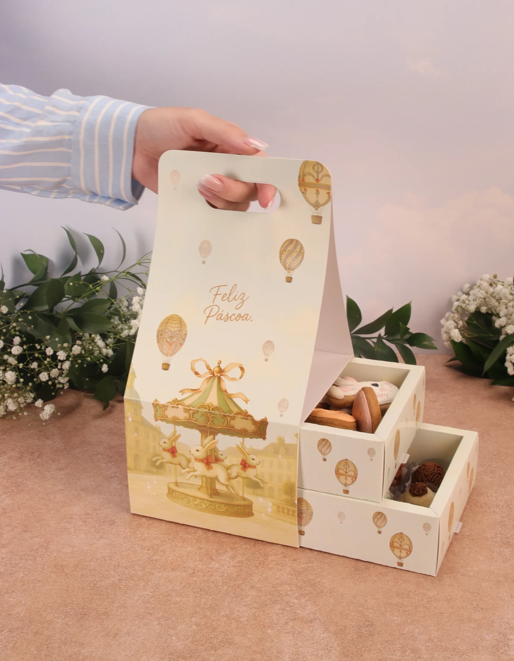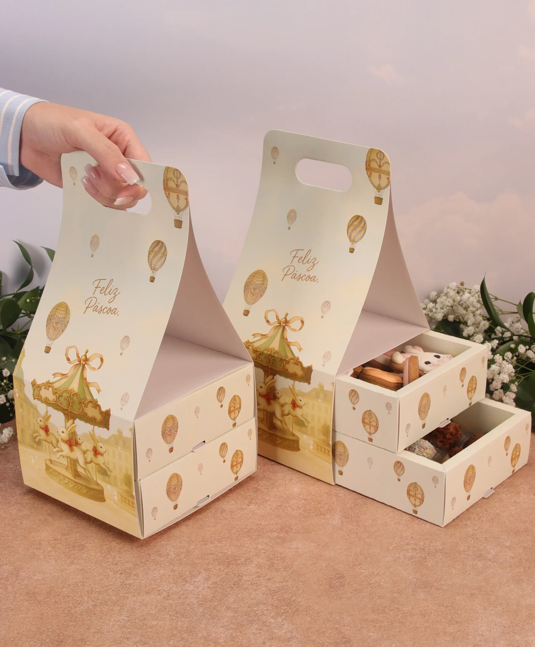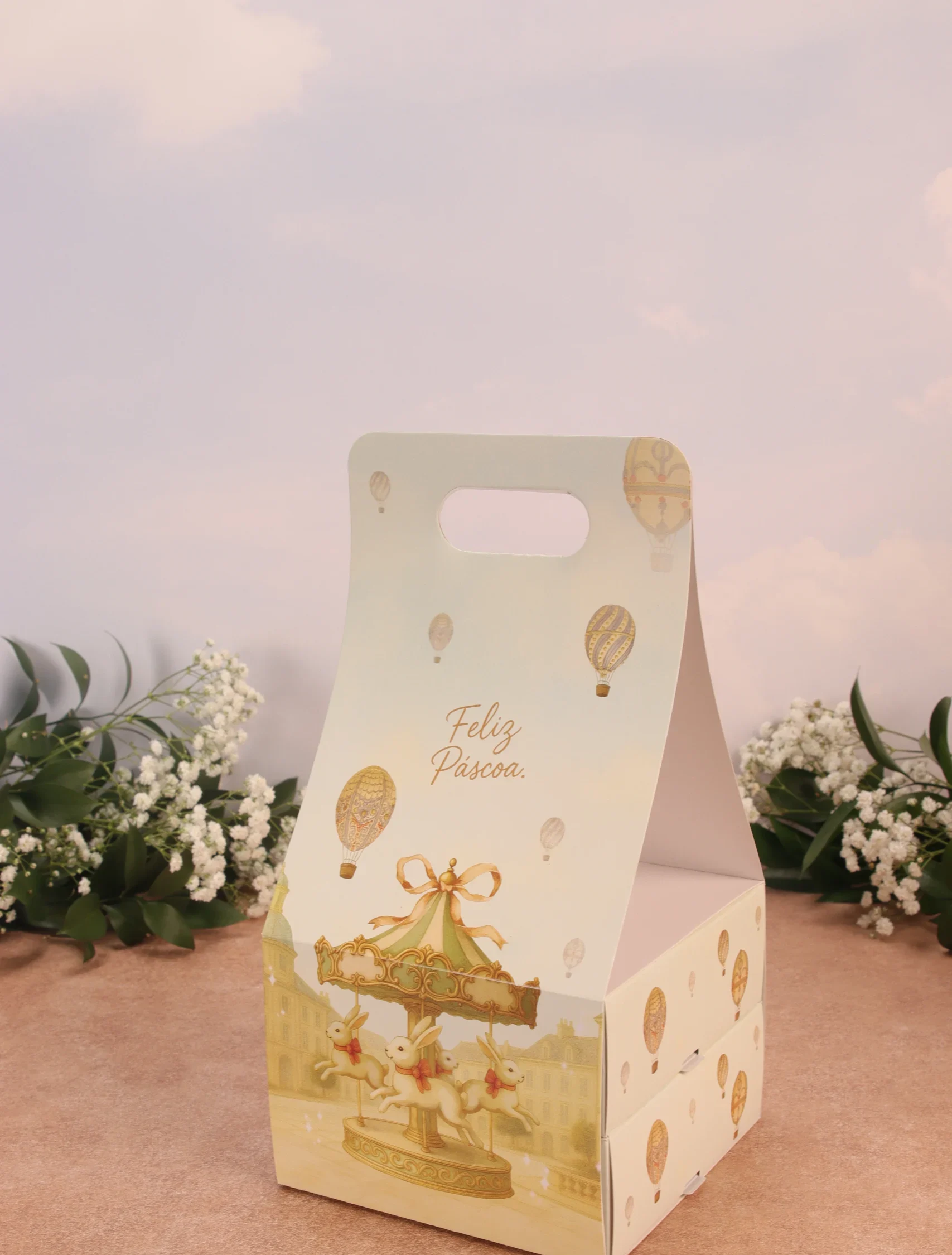 Caixa para drageados, CARROSSEL DE COELHOS, pacote com 10 unidades