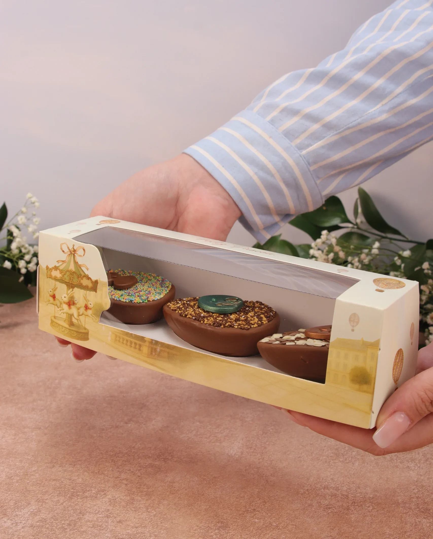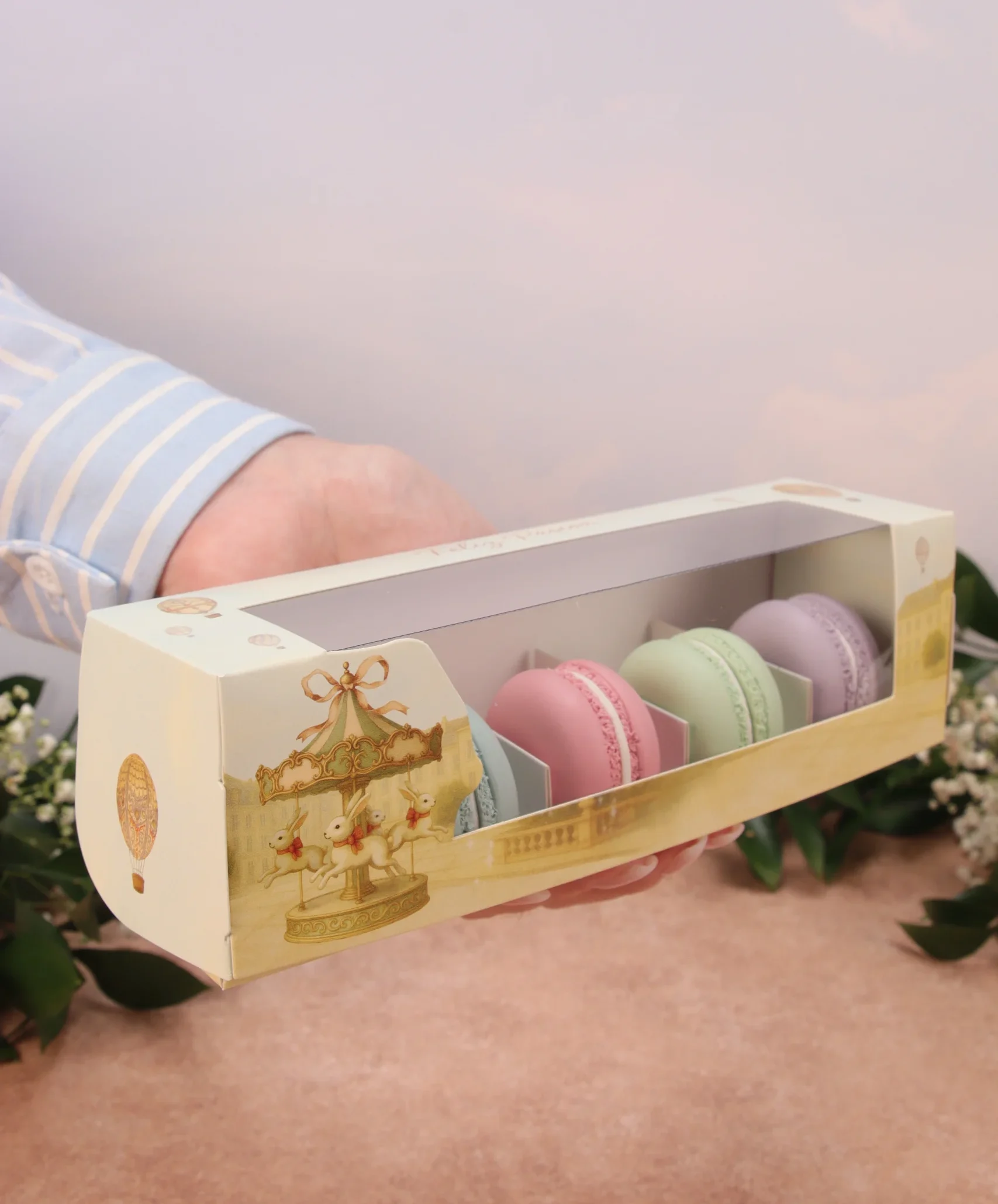 Caixa para 5 macarons ou trio de 50g, CARROSSEL DE COELHOS, pacote com 10 unidades